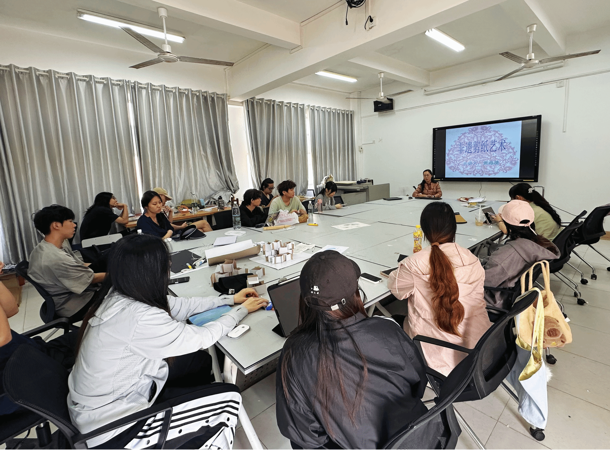 课堂上,黄海桃老师首先结合相关政策介绍,让同学们认识到剪纸艺术及中华优秀传统文化的重要性。接着从剪纸的起源与发展切入进行阐述,阐明了剪纸不仅是世界级非遗,更是中华民族共同体的符号象征。黄老师结合自己的作品和人生经历,分析了传统纹样的文化逻辑与象征寓意,着重讲述了她的作品对海南黎族图腾、热带植被及海洋文化等特色地域元素的融入方式。
