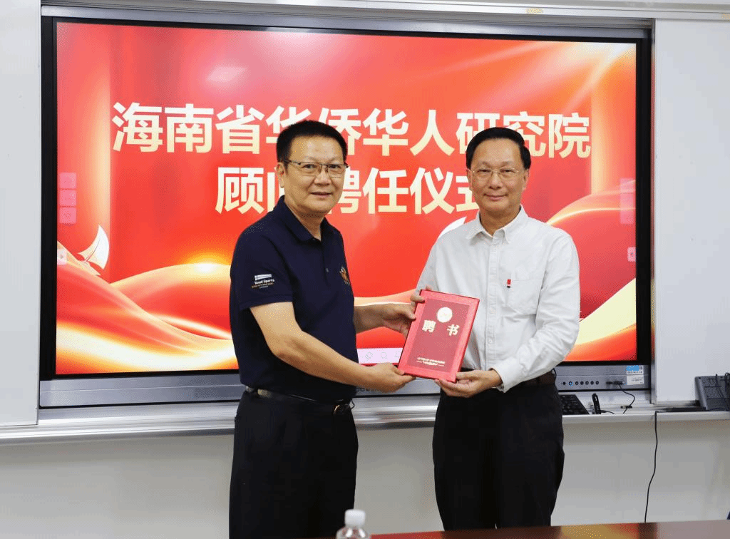 4月13日,海南省华侨华人研究院顾问聘任仪式在田家炳楼102会议室举行,聘任全国归国华侨先进个人、海南中藤科技股份有限公司董事长吴少宏为研究院顾问,金沙js5588党委书记符宣国为吴少宏颁发聘书。