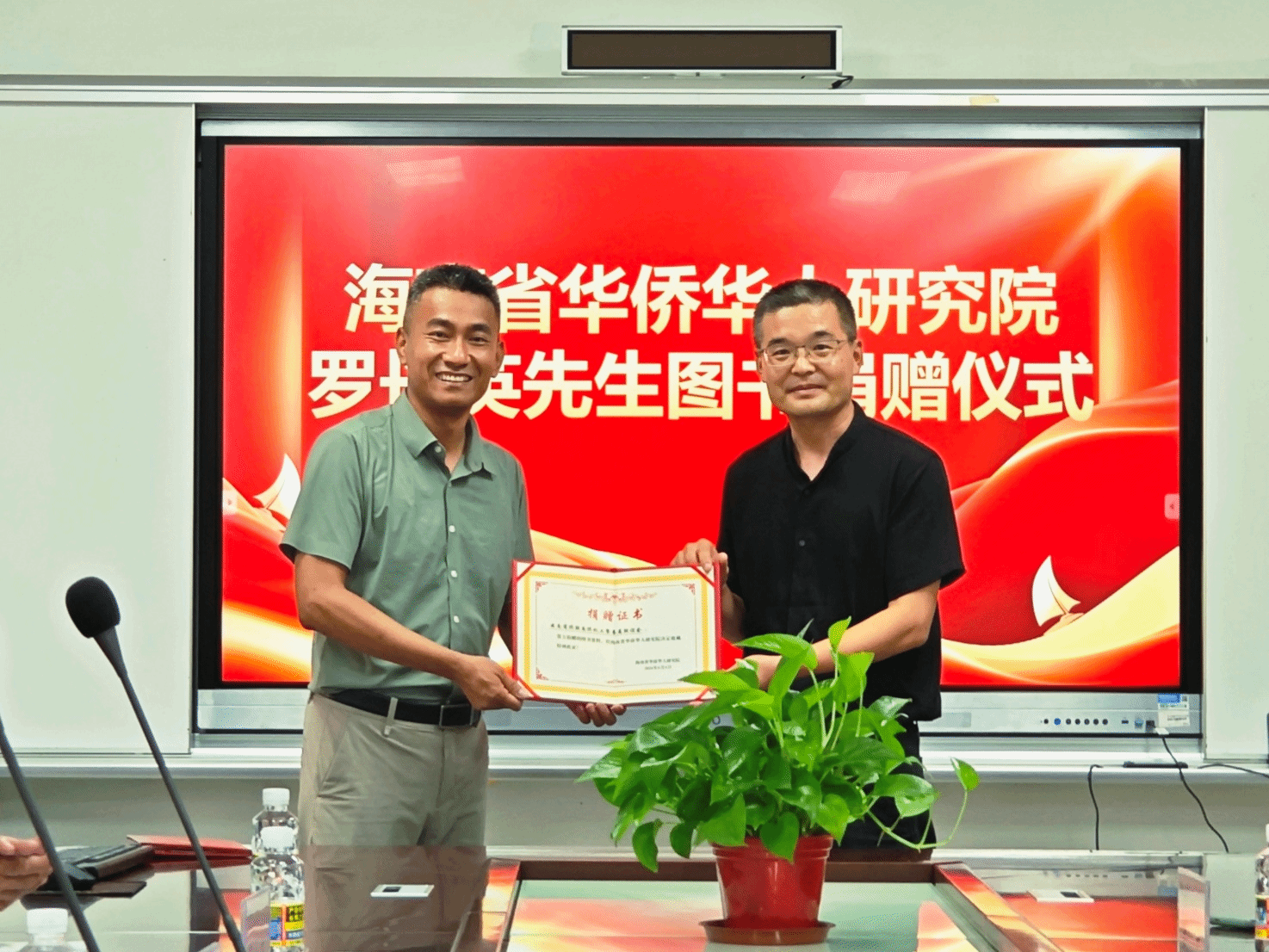 6月4日,海南省华侨华人研究院在田家炳楼举行罗长英先生图书捐赠仪式。研究院秘书长安华涛接受图书捐赠,并向罗长英先生、云南省侨联南侨机工暨眷属联谊会颁发了图书收藏证书。海口市侨联专职副主席苏先智、海口市南侨机工眷属联谊会会长罗长英、海口市南侨机工眷属联谊会理事陈良维、海口市南侨机工眷属联谊会理事罗章信、金沙js5588海德书公司党委书记韩胜丁出席活动,金沙js5588副教授孔泽鸣主持仪式。