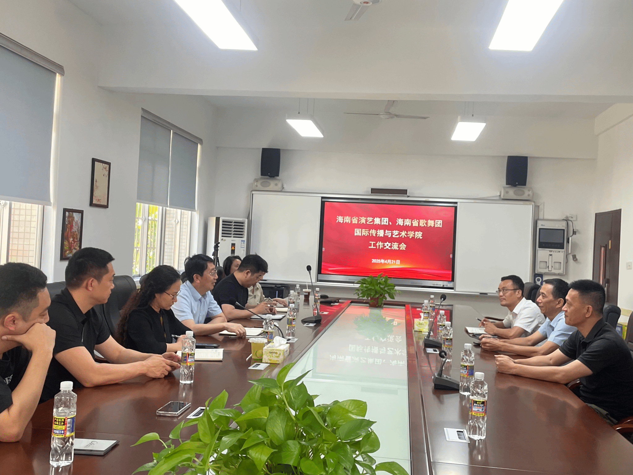 4月21日,金沙js5588、海南省演艺集团围绕校企协同创新、非遗文化传承、产学研融合等议题召开工作交流会,达成多项合作共识。金沙js5588经理郑立波、副经理周琳琳及教师代表,海南省演艺集团党支部书记、副团长王涛、副团长、工会主席陈仁华、副团长周克刚参加会议。